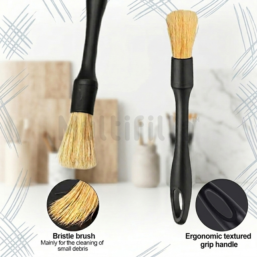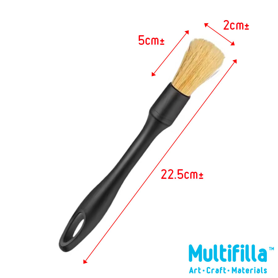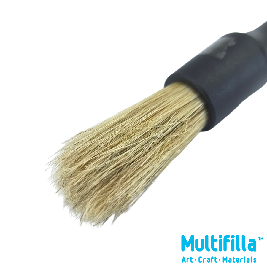 Firm, rigid and flexible this 4.5 cm long bristles hair brush is non halal. This natural hair is ideal to clean dust from air condition vent, blower fins, car radiator, keyboard and even use for dry brushing special effect in prop painting. Book binding as a glue brush. Sculptor and ceramic clean up after sanding. Gold gilding to remove excess gold foil. Ergonomic round plastic handle 18cm length for long reach. Maintain these durable natural bristles with Multifilla waterbase brush cleaner for a supple flexibility against breakages.