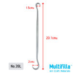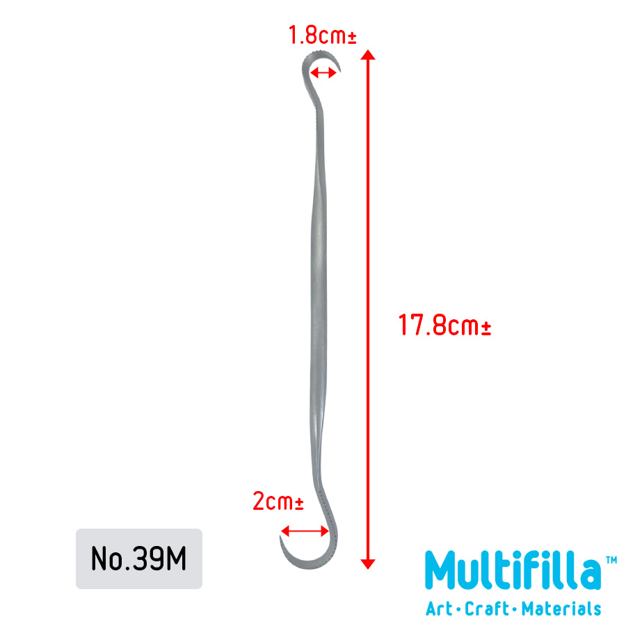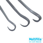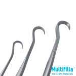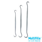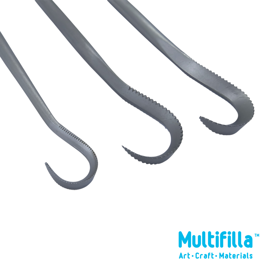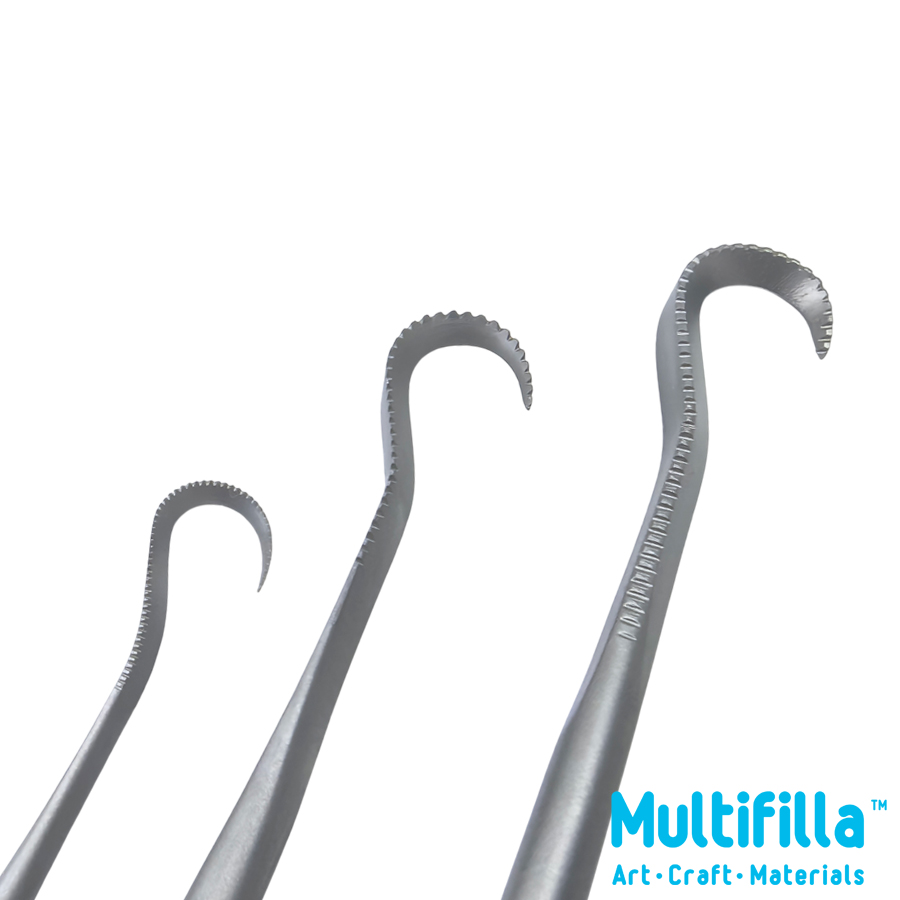 Serrated curve scrapper of different dimensions. Used sculpting natural clay, industrial styling clay, plaster, polymer clay as well in wax carving. The serrated teeth removes material a bit at a time or in large chunks in hard to reach areas. A useful tool in product designing, mold making. Also use to trim leather hard clay on a turning wheel.