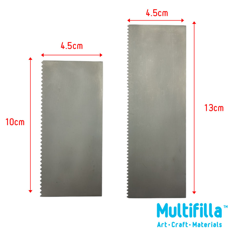Rigid straight one side, fine serrated teeth the other is a indispensible tool in sculpting. Its serrated rigid teeth removes controlled amount of material in sculpting with Plaster, natural clay, industrial oil styling clay, premix mortar and soap. In addition to its fine serrated pattern as decoration, the heavy steel teeth can also be used to remove dirty tiles grouting lines for re grouting. Scale modelers use serrated teeth as a glue spreader in miniature tiling and wood sheet lamination or wall papering.